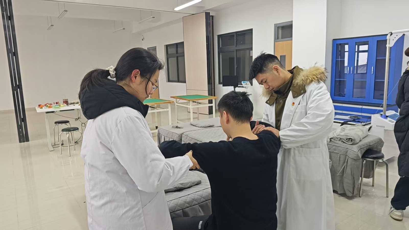 医事科技学院党支部发挥医学专业优势,组织开展中医特色义诊活动,提供推拿、刮痧、艾灸等公益理疗服务,以专业技能守护师生健康;