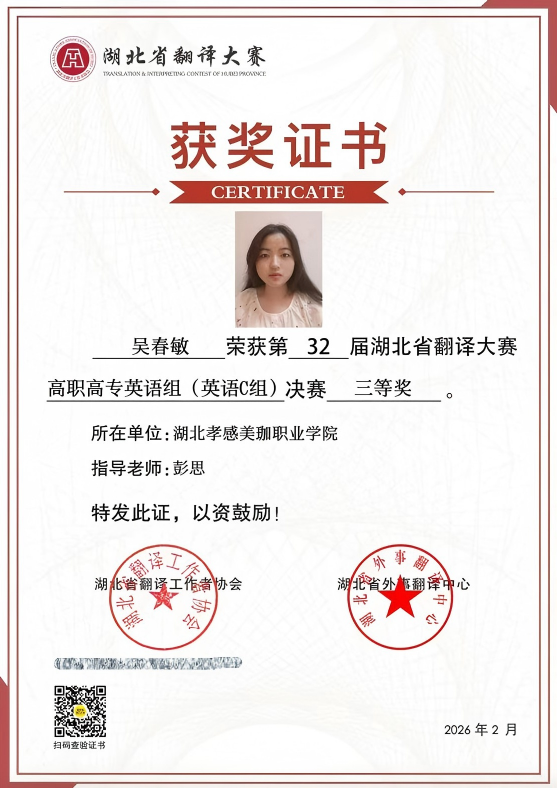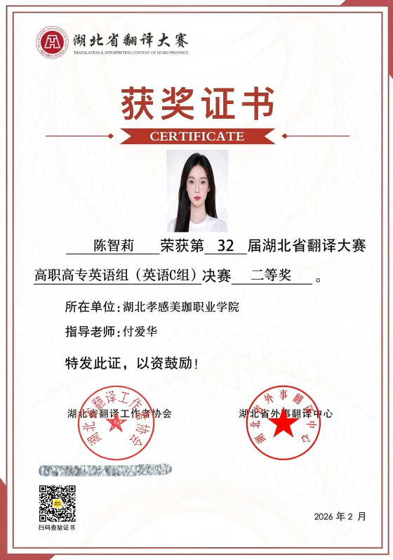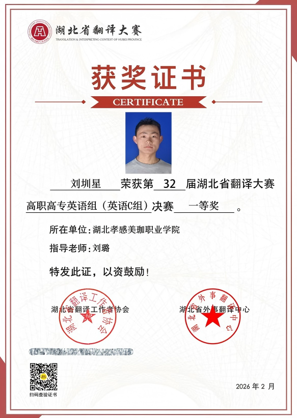 近日,2025年第32届湖北省翻译大赛高职高专英语组(英语C组)决赛成绩公布,我校学生在比赛中表现优异,在激烈的竞争中脱颖而出,取得了令人欣喜的成绩。荣获一等奖一项,二等奖一项,三等奖两项。