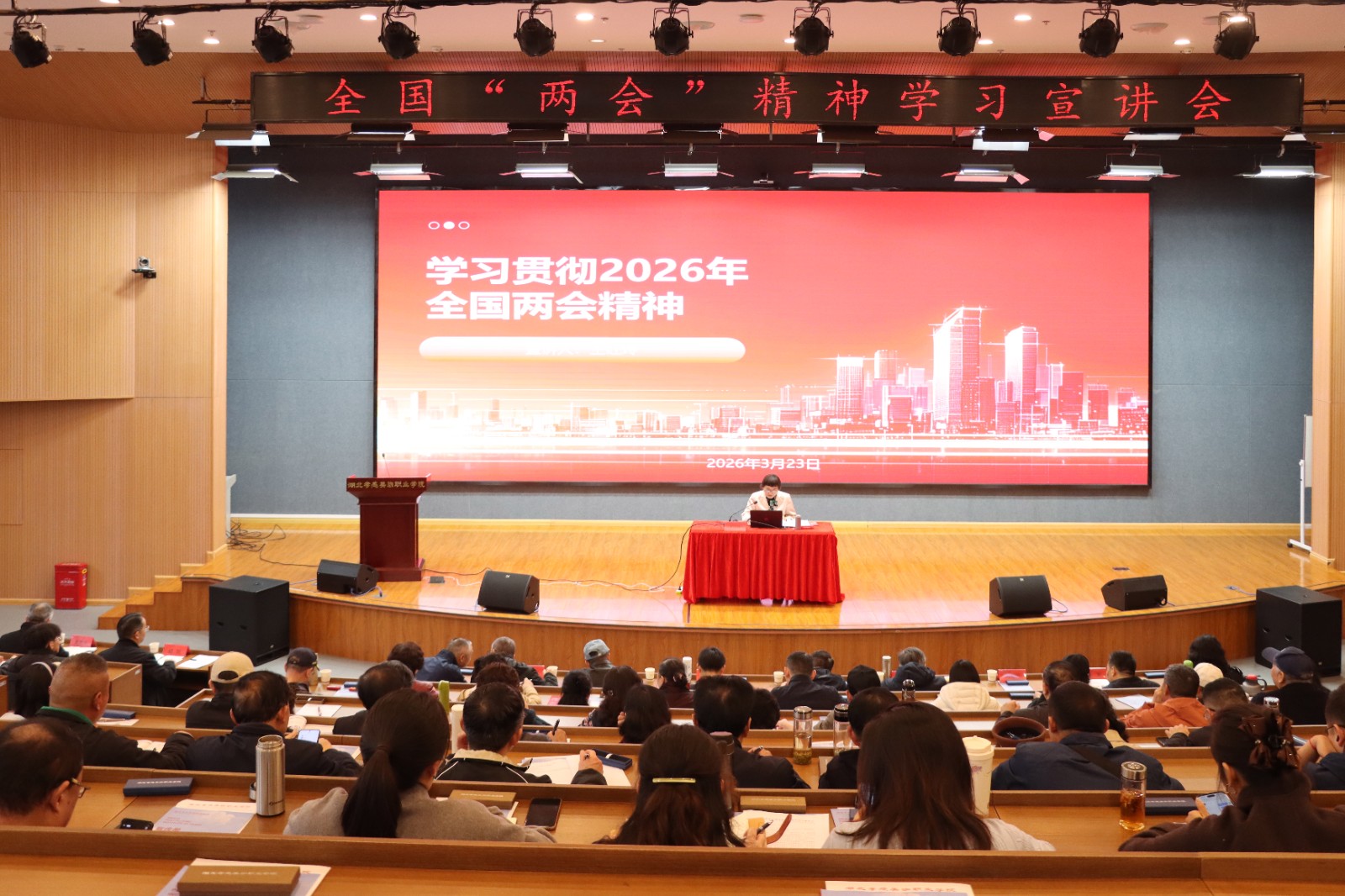 美珈职院党委书记胡剑在总结讲话中指出,王红玲副主席结合深厚的学术背景与丰富的参政议政经验,作了一场主题鲜明、内涵深刻、内容翔实的精彩宣讲。宣讲深入浅出,既有理论高度,又有实践深度,具有很强的思想性、指导性和感染力,使与会人员深受启发、倍感振奋。他强调,学习贯彻全国“两会”精神是当前和今后一个时期的重要政治任务。希望全校师生以此次宣讲为契机,进一步统一思想、凝聚共识,切实把学习成果转化为推动学校高质量发展的实际动能。