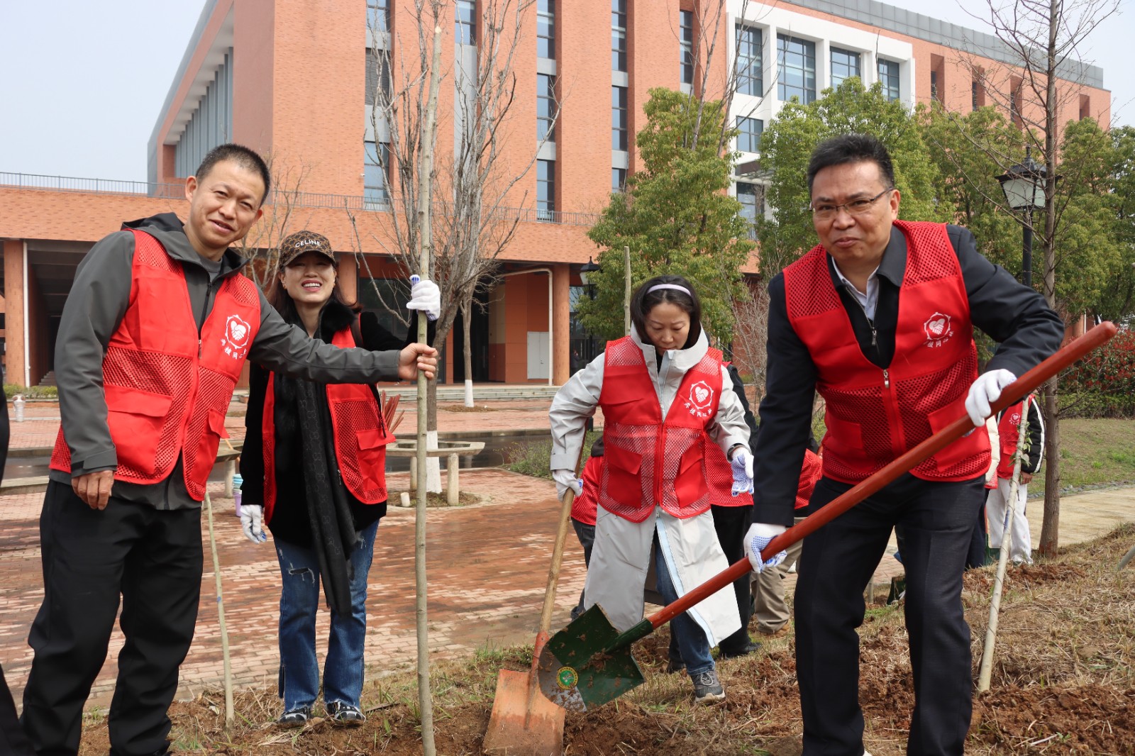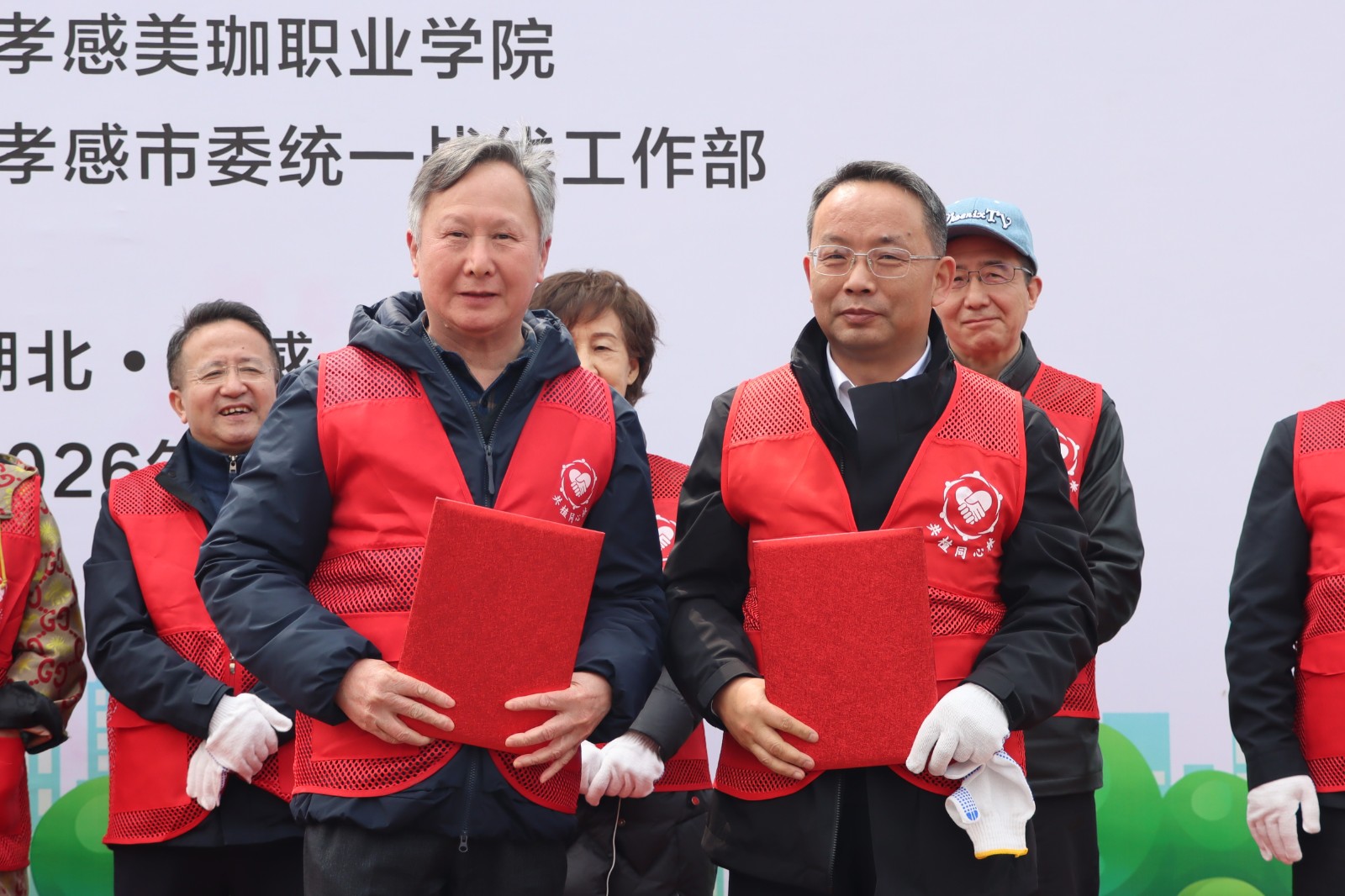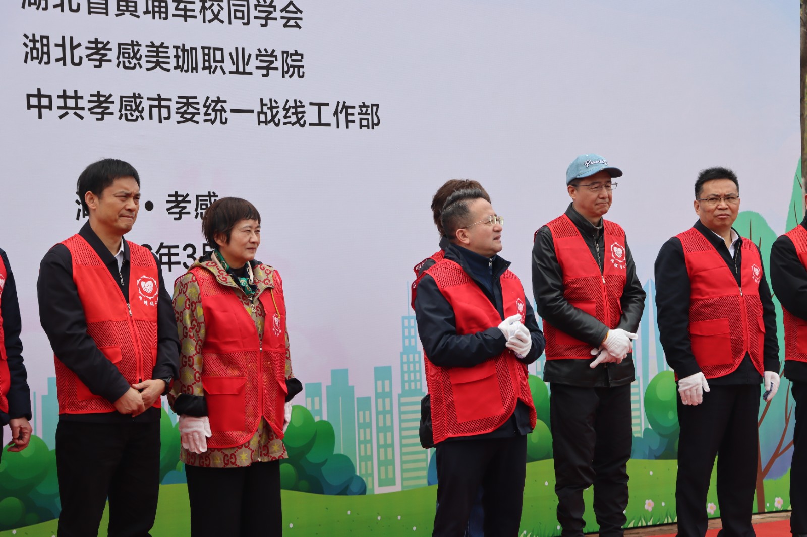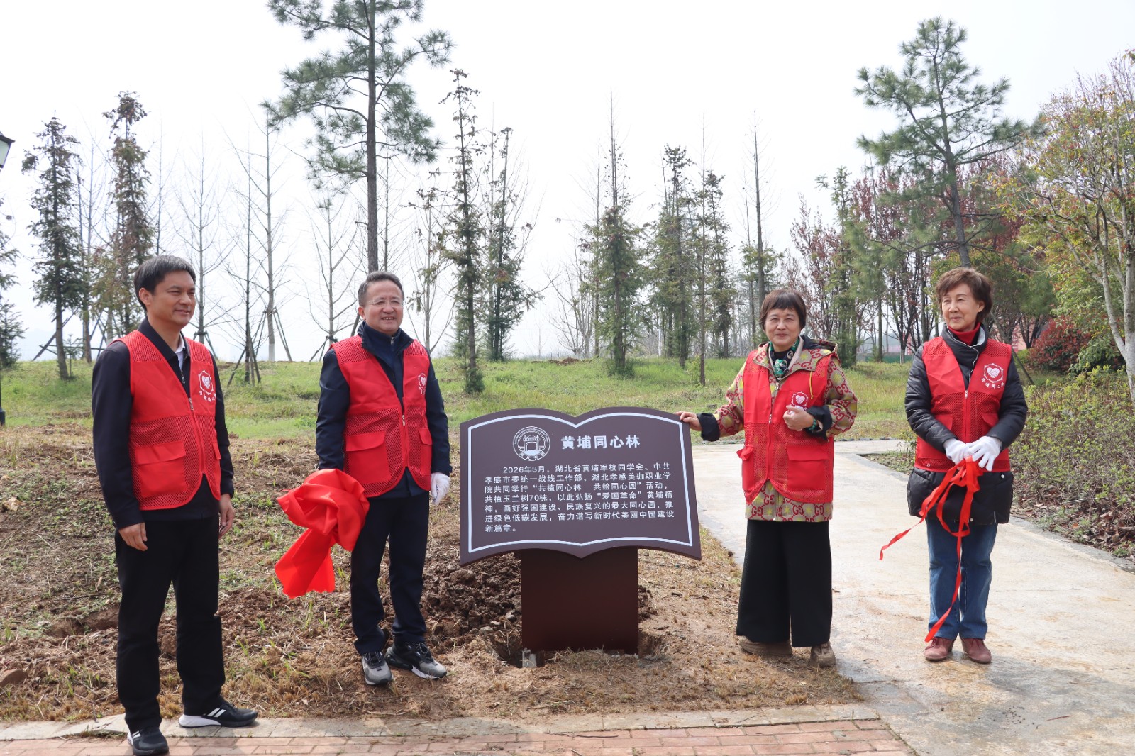 省政协副主席王红玲、省委统战部副部长江浩、孝感市委常委、统战部部长贺卫东与美珈职业学院董事长陈惠兰共同为“黄埔同心林”揭牌。随后,与会人员一同挥锹培土,合力栽下70余棵白玉兰树。